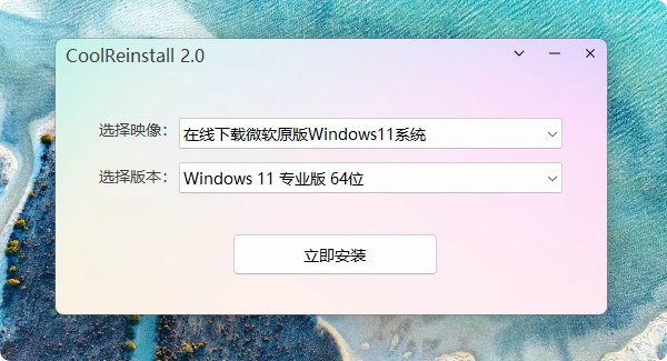 玩酷之家一键重装(CoolReinstall)是由玩酷之家开发的一款桌面环境使用的Windows系统安装工具,无需优盘PE启动盘,在桌面环境可直接一键安装Windows系统。本工具除了可以使用自己的系统镜像(支持ISO\WIM\ESD\SWM格式),还可以直接下载微软原版镜像安装。