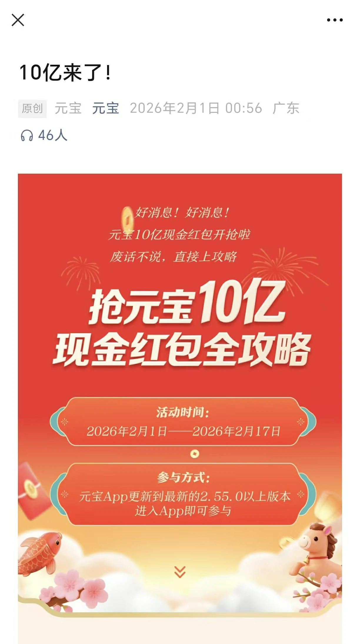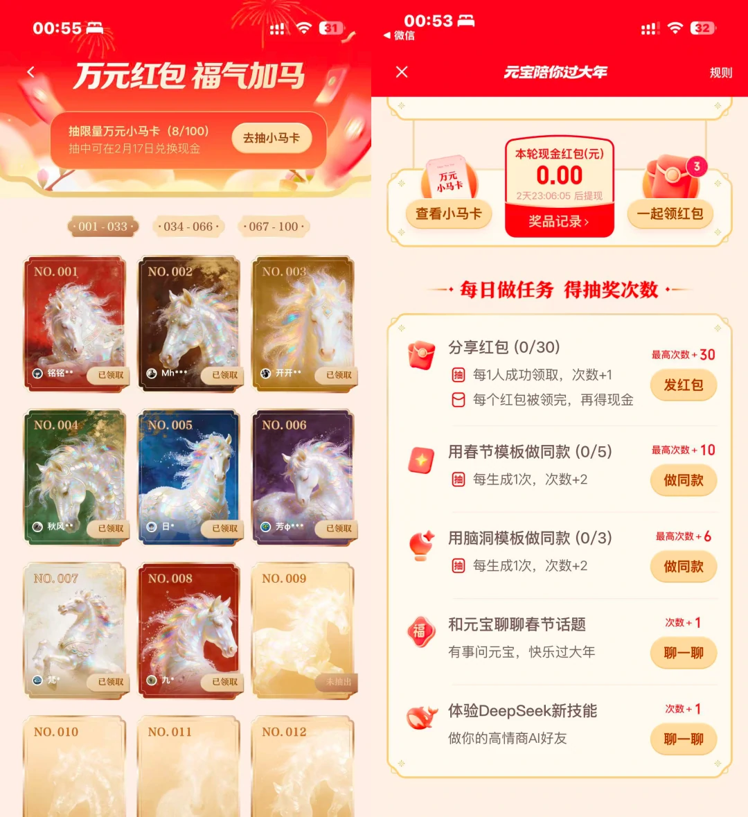 2026年2月1日零点,腾讯元宝“抢10亿现金红包”活动正式开启,一夜之间掀起全网狂欢。截止到发文已有16张万元小马卡被抽中,共一百张!