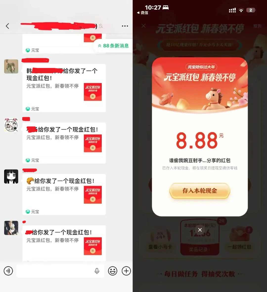 但每人每天仅能领取三次红包,所以从2026年2月1日至2月17日,你的微信群聊会被元宝红包刷屏,谁会跟这几毛钱过不去呢?哈哈!!