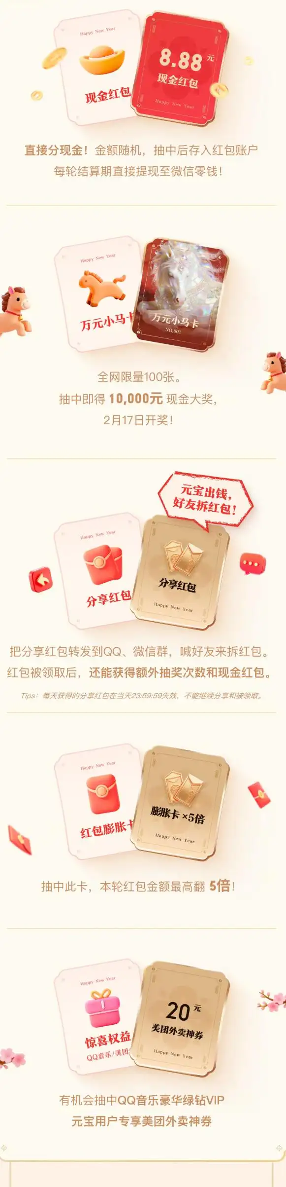 活动的模式和内容也非常简单,和往年的“集福”没有太大区别。做任务获取抽奖次数,抽奖获取现金红包等奖励,最吸引人的就是限量100张的万元“小马卡”,目前已经被抽走16张,我的心在滴血!!!