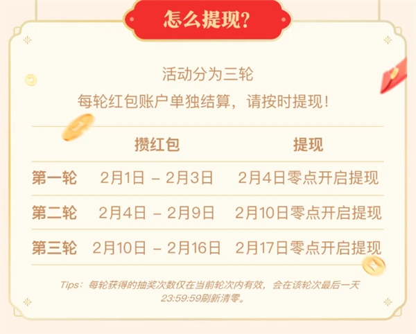 红包金额随机,抽中后将存入红包账户,每轮结算期可直接提现至微信零钱。