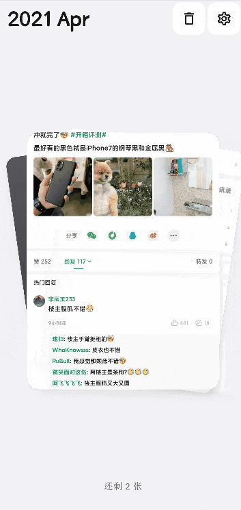 之后挑选图片清理的时候,就可以通过下滑来放到指定文件了,可以看到动画也很丝滑,和 macOS 类似的缩放质感。