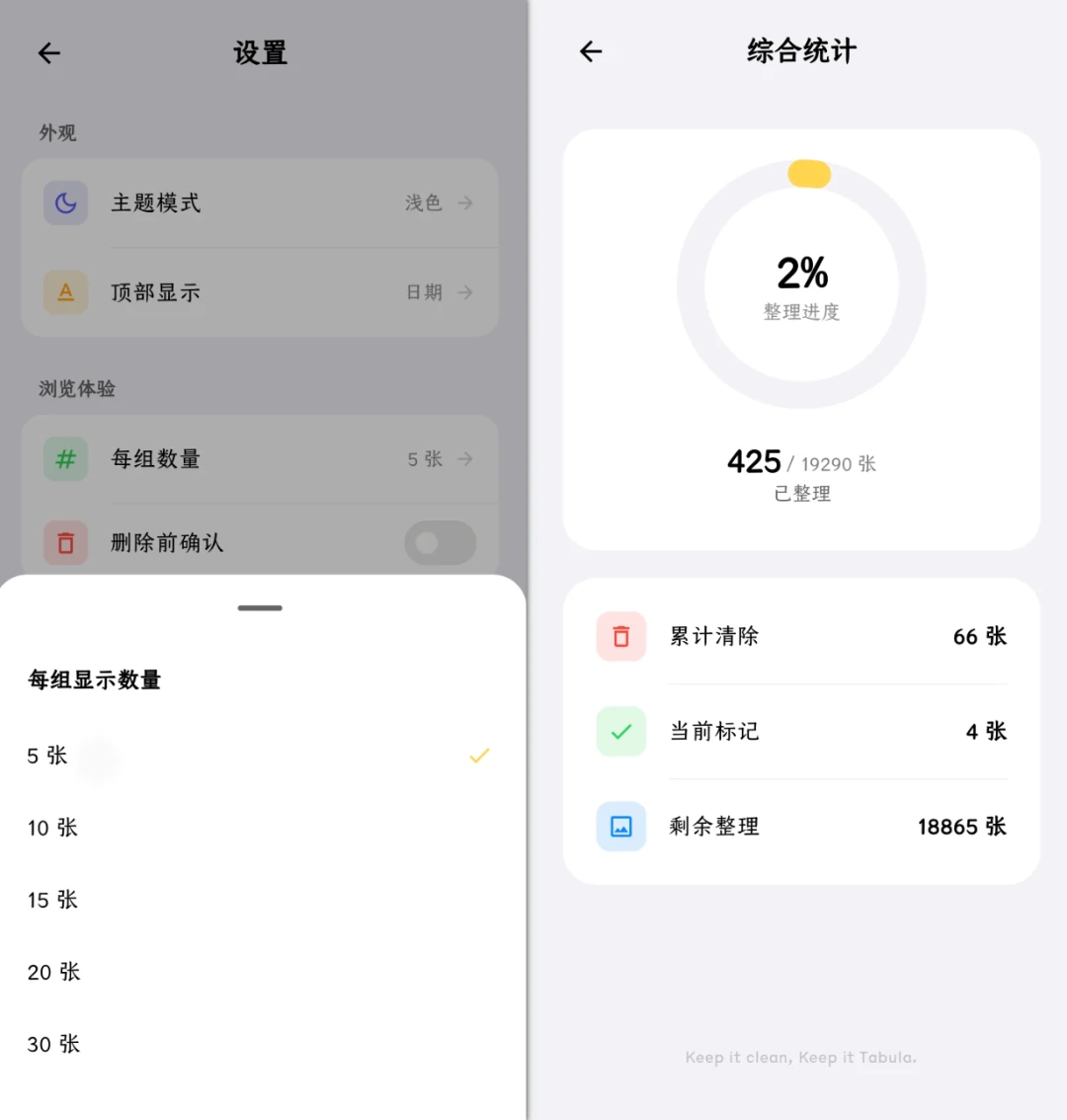 想要知道自己整理了多少图片,Tabula 也有一个综合统计的页面,在这里能看到总体整理的进度,累计清理的数量等等。