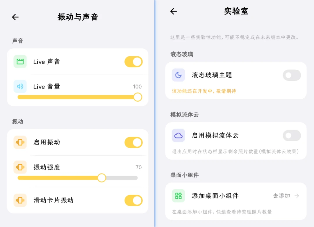还有就是喜欢震动和触觉反馈的话,可以开启震动和声音,主体则有液态玻璃和模拟流体云的效果,甚至还可以添加小组件,来提醒你整理了多少张图片。