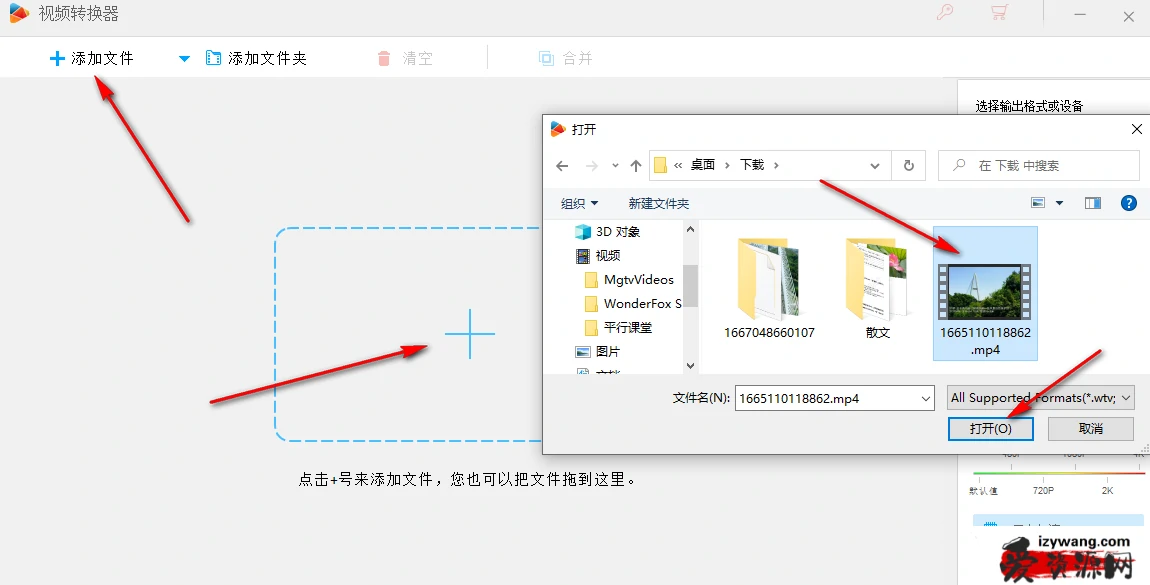 2、第二步,点击视频转换选项之后,我们进入视频转换页面,在该页面中我们可以点击左上角的添加文件选项,也可以点击页面中的“+”图标,然后在文件夹页面中选择自己需要转换的视频文件,点击“打开”,还可以直接将文件夹页面中的视频拖入视频转换页面中。