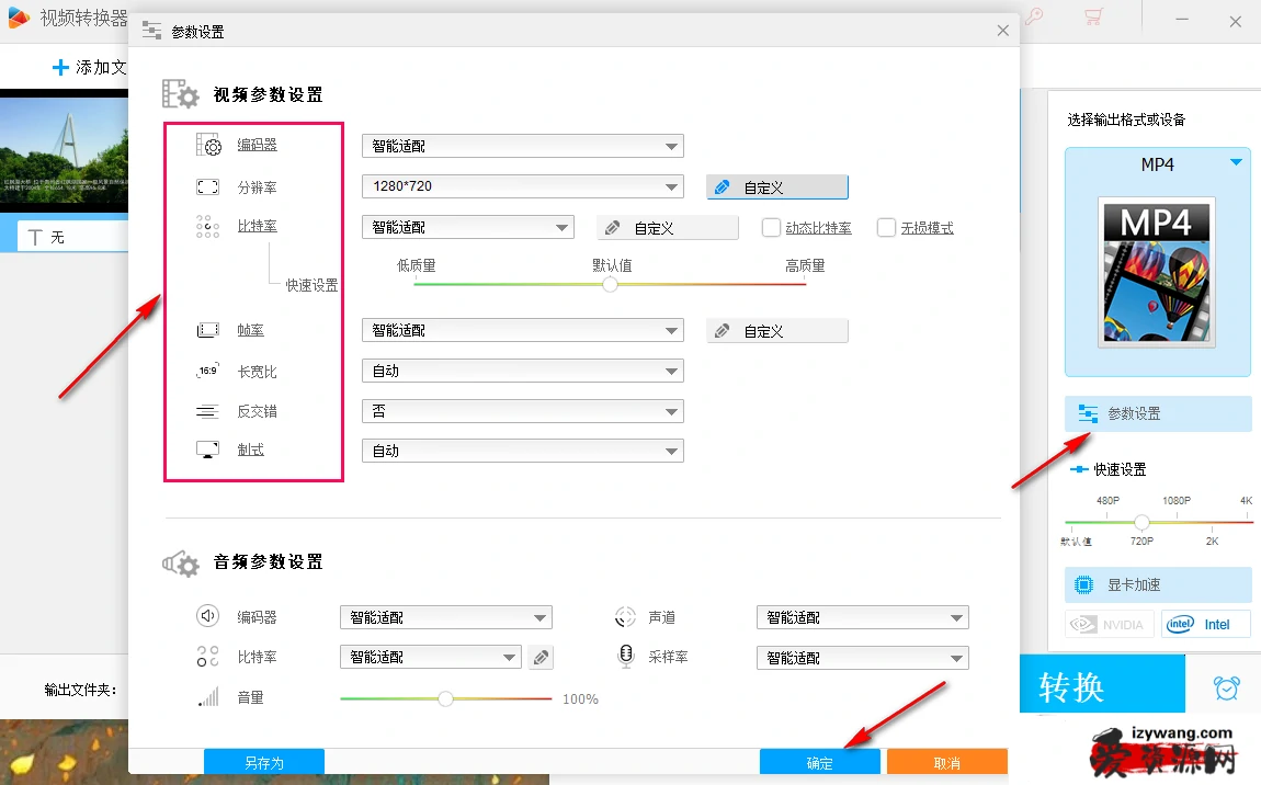 4、第四步,接着我们点击右侧的“参数设置”选项,然后在参数设置页面中,我们可以设置视频的编码器、分辨率、比特率、帧率、长宽比等,设置完成之后我们点击“确定”选项。