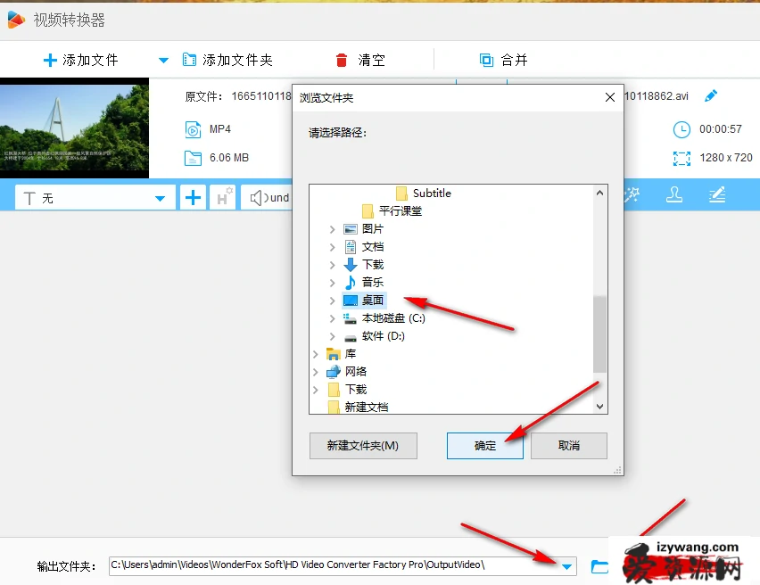 6、第六步,接着我们点击页面下方的文件夹图标,可以查看该软件的输出文件夹,点击倒三角图标可以在浏览文件夹弹框中选择新的保存路径,选择好新的保存文件夹之后我们点击确定选项。