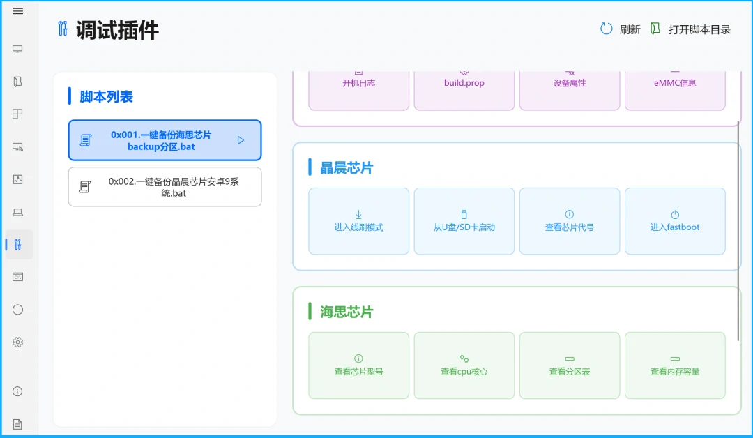 支持自定义加载bat批处理、py脚本等插件,比如免拆批量刷盒子,一键备份机顶盒系统固件;