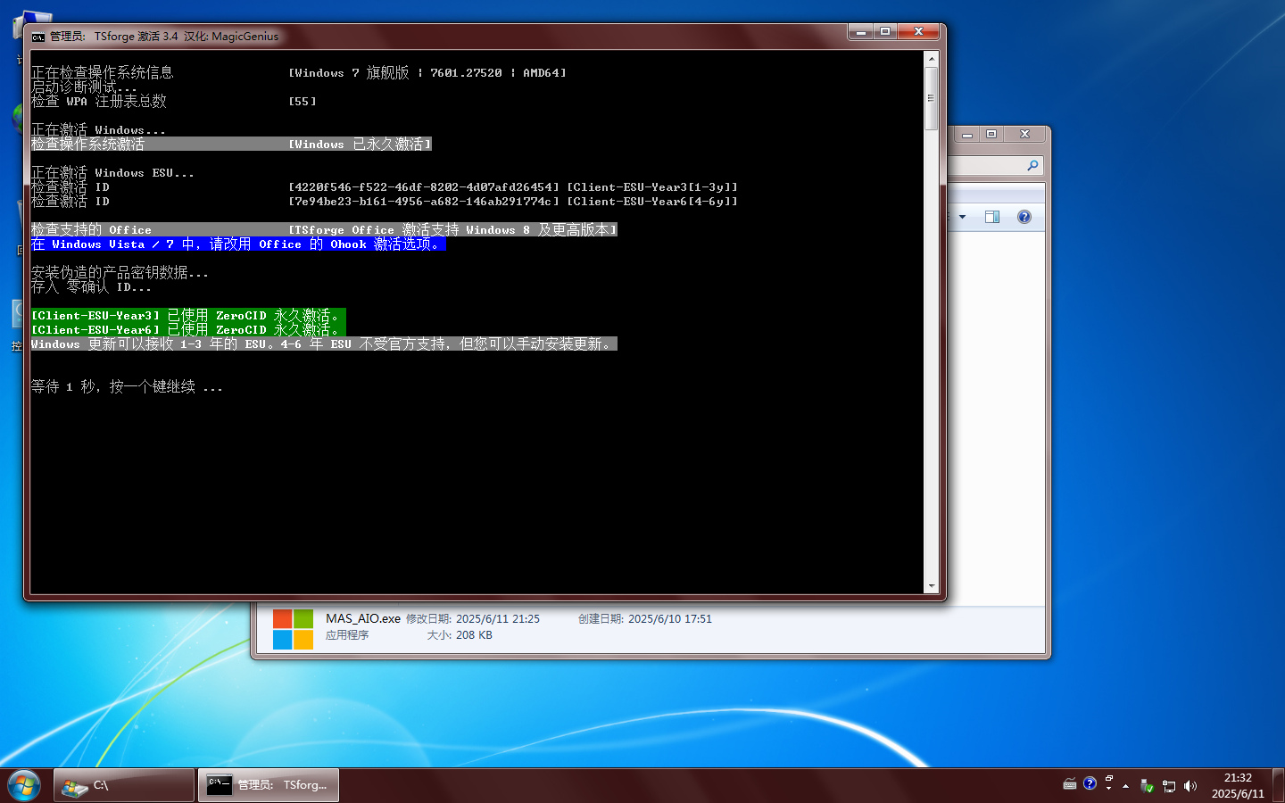 实现正确的激活顺序HWID→Ohook→TSForge,最后直接简单编写代码实现W与O的校验(单独设置一个CMD脚本,修改原MAS代码增加参数风险极大),实现一键激活+检测!