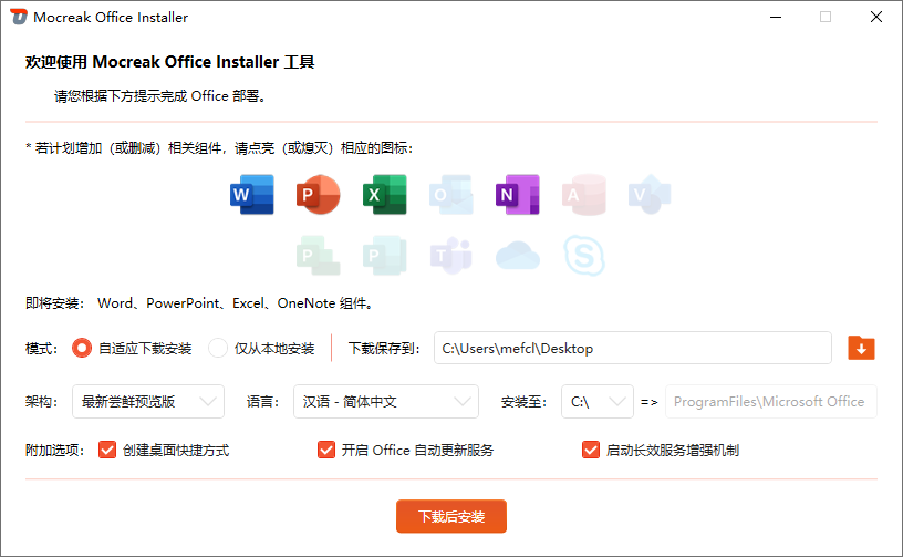Mocreak Office Installer 是一款一键自动化下载、安装、部署正版 Office 的办公增强工具。该工具完全免费、无广告、绿色、无毒、简约、高效、安全。
