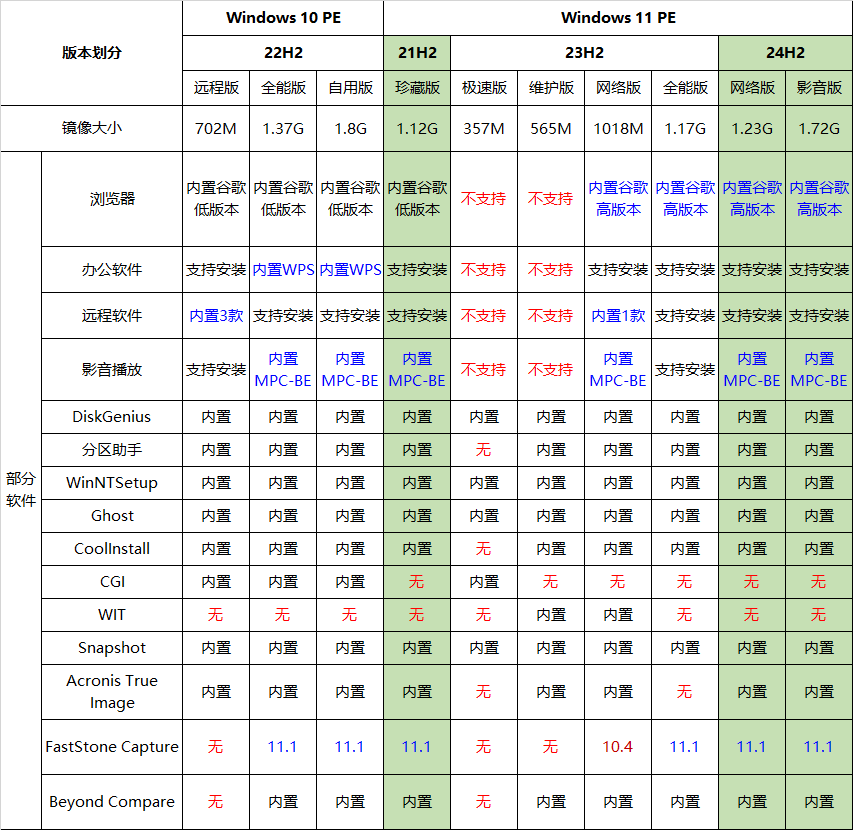 (4)最全版本,本系列PE从无网维护、到声显网蓝牙影音办公打印所有版本齐全,内核涵盖Win10_22H2到Win11_24H2,针对不同用户需求,定制了维护版、远程版、网络版、影音版和全能版等。